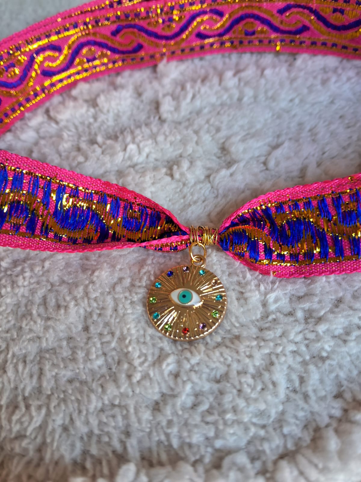 Un choker vibrante, lleno de color y personalidad. Está hecho con una cinta textil artesanal en tonos fucsias, dorados y azules que destaca al instante. En el centro, un dije dorado con ojo protector y cristales multicolores aporta un toque místico y moderno a la vez.